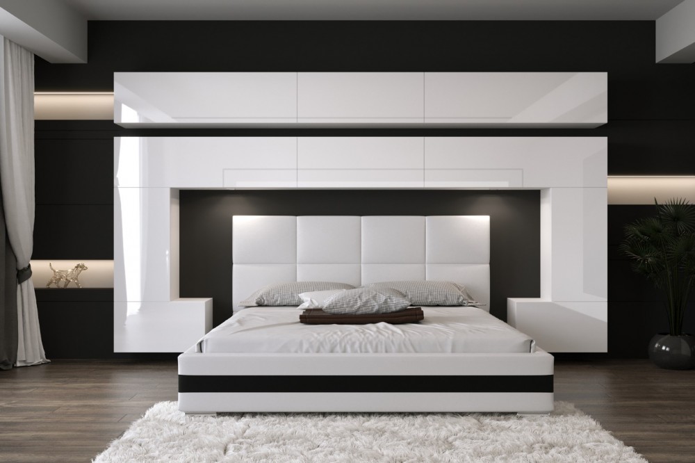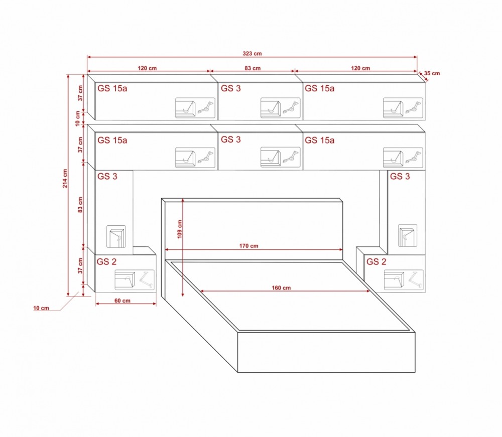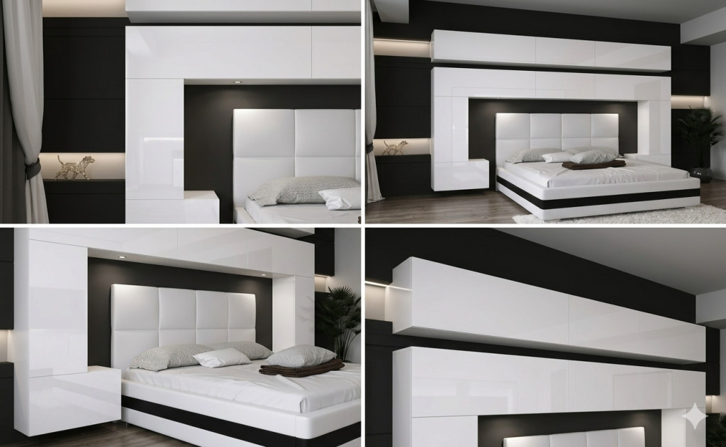 Az 5M készletet úgy terveztük , hogy bármilyen méretű ágyhoz illeszkedjen. Ebben az opcióban a szekrények az ágy felett kapcsolódnak egymáshoz.